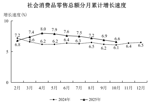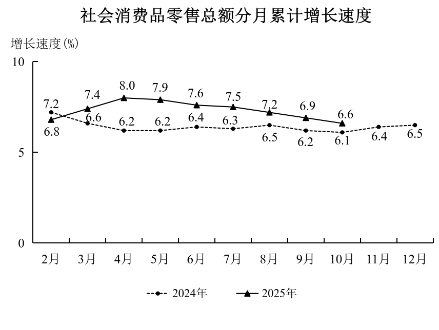 2025年1-10月社会消费品零售总额分月累计增长速度